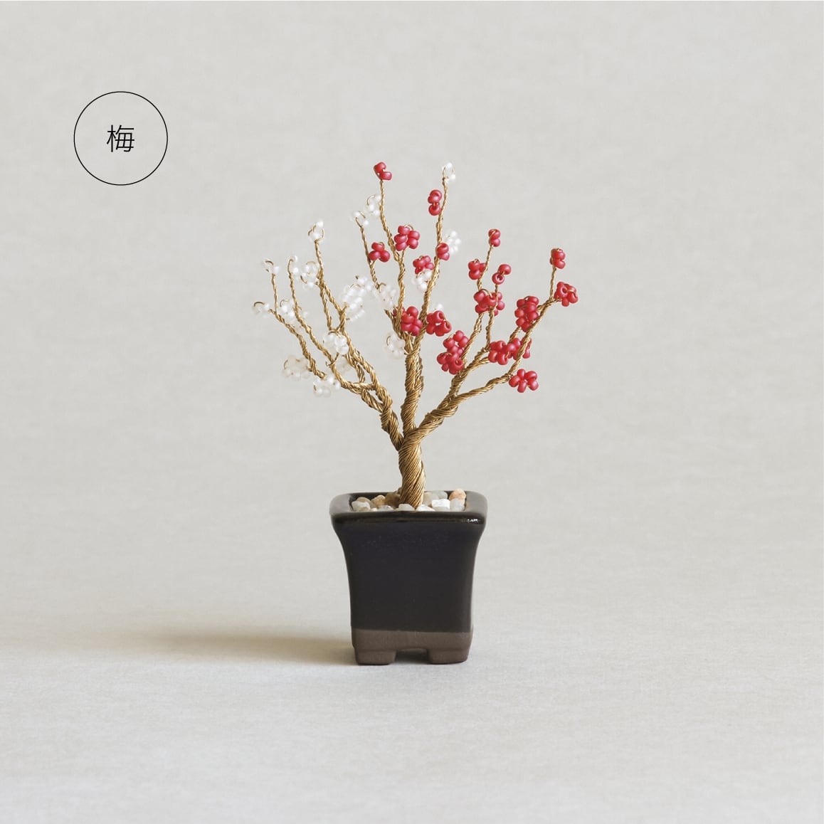 冬の終わりを告げる“三冬の花”のひとつ。厳しい冬に咲く梅は、忍耐や気品の象徴とも言われます。 枝に寄り添うように点々と咲く花を、紅白のビーズで表現しました。はっきりとした色味が目を惹きます。