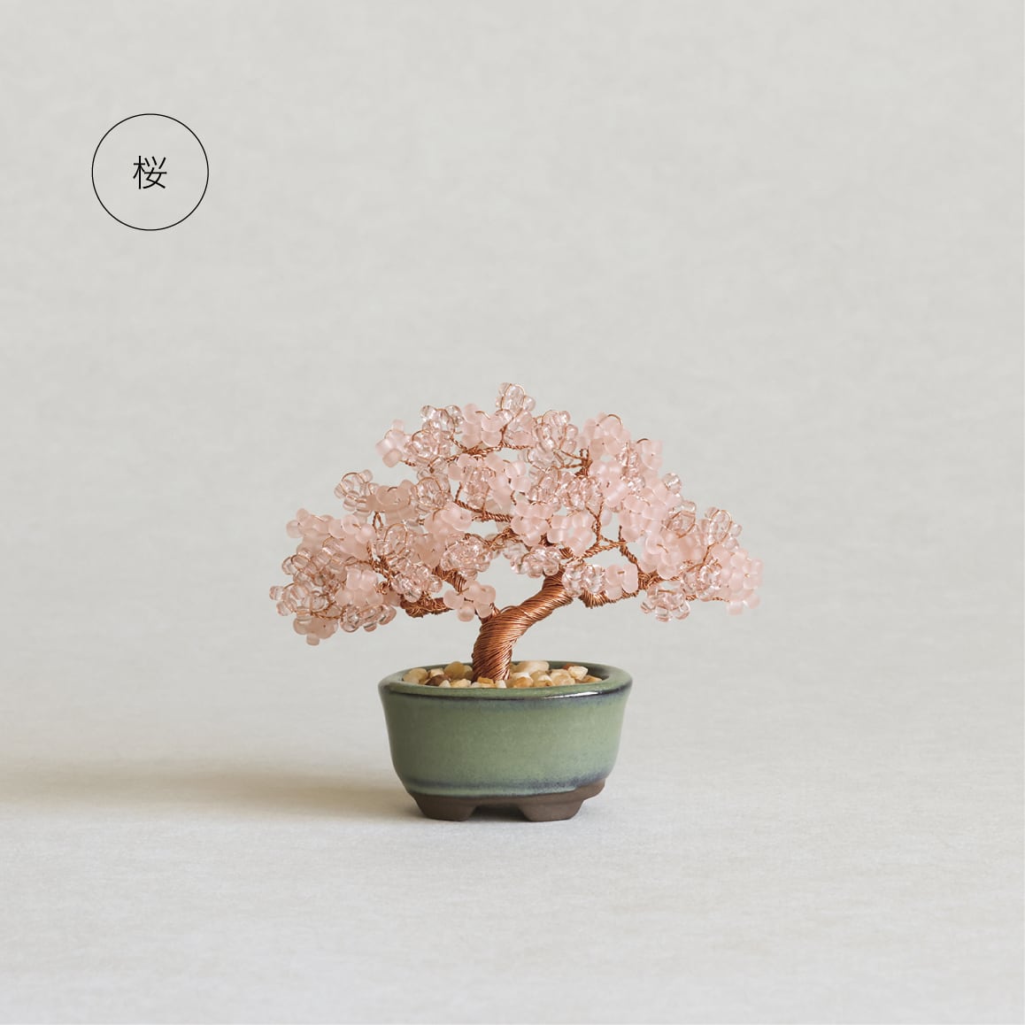 日本を代表する花のひとつ。春に咲く桜は、新しい始まりや希望の象徴とも言われます。 満開の花を表現するために、ビーズは少し大きめのものを使用しています。透明と半透明の重なりによって、奥行きを感じることができます。