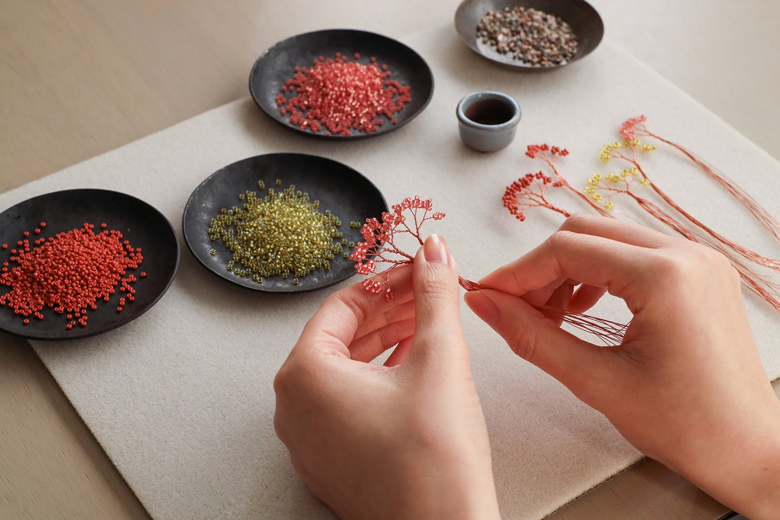 つくりかたは、ワイヤーにビーズを通してねじるだけ。土台となる鉢や砂利なども、すべてセットになっているため、ハサミとものさしがあればつくることができます。